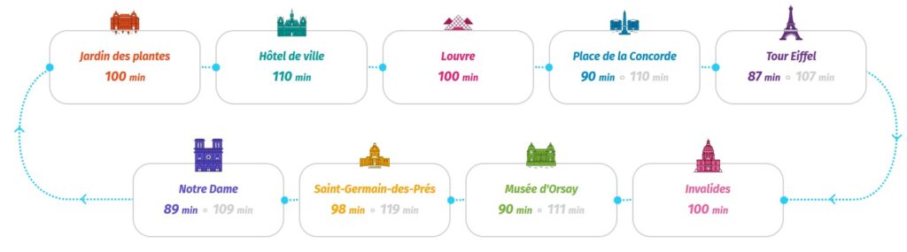 Eiffel Tower / Musée d’Orsay / Saint-Germain-des-Prés / Notre-Dame Cathedral / Jardin des Plantes / Hôtel de Ville / Louvre Museum / Champs-Élysées (near Place de la Concorde) / Beaugrenelle